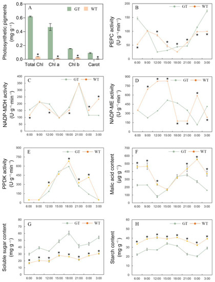 Photosynthetic characters of the central green photosynthetic tissue (GT) and marginal white albino tissue (AT) of the chimeric leaves. Photosynthetic pigment contents in the GT and AT (A). Activities of PEPC enzyme in the GT and AT (B). Activities of NADP-MDH enzyme in the GT and AT (C). Activities of NADP-ME enzyme in the GT and AT (D) and Activities of PPDK enzyme in the GT and AT (E). Malic acid content in the GT and AT (F). Soluble sugar content in the GT and AT (G). Starch content in the GT and AT (H). Asterisks in the graphs represents significant difference by T-test (p < 0.05).
