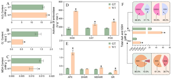 The ROS equilibrium of the central green photosynthetic tissue (GT) and marginal white albino tissue (AT) of the chimeric leaves. H2O2 content in the GT and AT (A). O2•− content in the GT and AT (B). MDA content in the GT and AT (C). Activity of SOD, POD and CAT (D). Activity of enzymes in the AsA-GSH cycle (E). Contents of antioxidants in the AsA-GSH cycle (F). Asterisks in the graphs represents significant difference by t-test (p < 0.05). TAA, total ascorbic acid content. TG, total glutathione content.