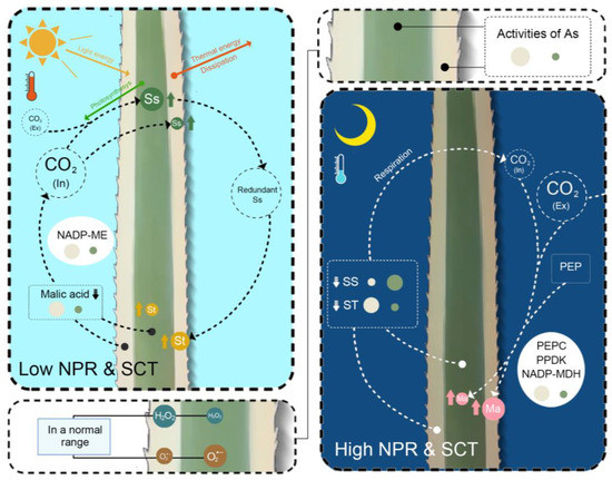 Studies on CO2 fixation and utilization subject to crassulacean acid metabolism (CAM) in plants have been reported [39,40,41]. Generally speaking, the feature of CAM is that CO2 is fixed and combined with PEP through catalysis of PEPC enzymes to form OAA, and then OAA is transformed into malic acid and stored in the vacuole, which results in an increase in malic acid content during nocturnal times; conversely, to avoid excessive evaporation of internal moisture, malic acid is catalyzed as CO2 to supply photosynthesis without opening stomata during diurnal periods [42,43,44]. Based on the predominant enzymes employed during the daytime decarboxylation of malate leading to intracellular CO2 release, CAM plants were divided into two general groups. Among the 1893 species of plants in the Bromeliaceae family, 57% of species exhibit CAM characteristics [45]. In the photosynthesis progress of Ananas comosus var. bracteatus, the CO2 is fixed in malic acid during the night, and the higher NADP-ME activity helps to release CO2 from malic acid for photosynthetic utilization during the day. Therefore, we speculate that it is NAD(P)-malic enzyme (ME)-type species, which decarboxylates malate to release CO2 and pyruvate, with pyruvate being regenerated to PEP by PPDK [46].