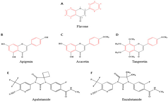 (A) The chemical structures of flavones (apigenin, acacetin, tangeretin), Apalutamide and Enzalutamide. The information on the chemical structure of (B) apigenin, (C) acacetin, (D) tangeretin, (E) Apalutamide and (F) Enzalutamide were from PubChem (https://pubchem.ncbi.nlm.nih.gov/, accessed on 3 February 2023). The red color is a typical structure derived from flavonoids and the numbers are carbon position. These images were created using ChemDraw Pro 8.0.