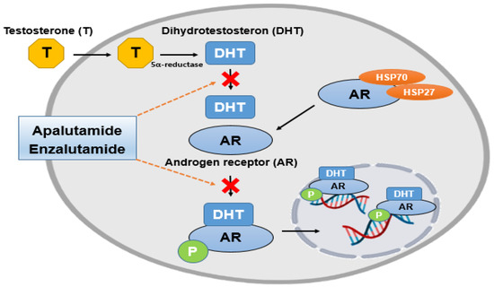 Representative second-generation anti-androgen therapies include apalutamide (Figure 1E) and enzalutamide (Figure 1F). Androgens are converted to dihydrotestosterone (DHT) by 5-alpha reductase, and DHT binds to the androgen receptor, which is inhibited by both drugs [65] (Figure 2). Enzalutamide inhibits AR DNA binding, coactivator recruitment and AR nuclear translocation. Apalutamide, developed after, is a nonsteroidal anti-androgen that acts as an inhibitor of the ligand binding domain of the androgen receptor. This binding inhibits translocation to the nucleus and DNA binding. In short, it is an anti-androgen agent that acts as an androgen receptor antagonist, which is the main target of androgens, male hormones such as testosterone and dihydrotestosterone (DHT) [75]. It is more effective than enzalutamide, and blood-brain barrier permeability is reduced to decrease the risk of seizures. The FDA approved this drug in February 2018 [74,76].