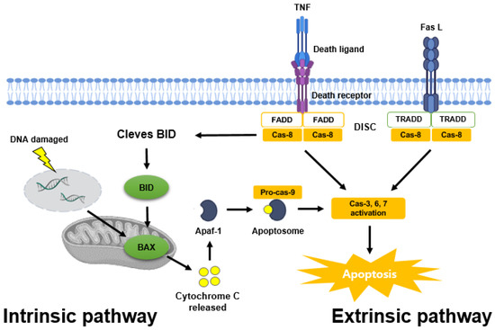 If apoptosis does not occur properly in cancer cells, the cells will proliferate indefinitely, invade and metastasize to other tissues and show a poor prognosis [81]. As such, apoptosis is considered necessary in cancer cells, and there are two pathways for apoptosis. One is the intrinsic pathway, and the other is the extrinsic pathway [82] (Figure 3).