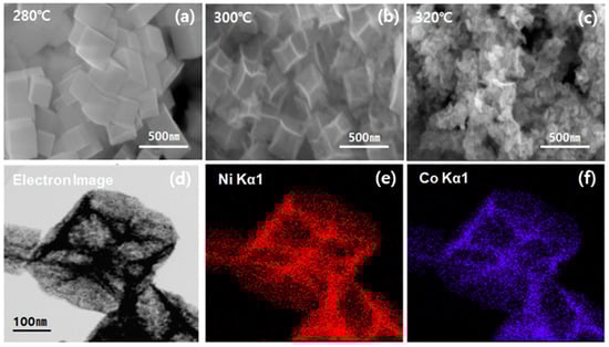 (a–c) SEM images of H–NiCoPBA after annealing at each temperature for 1 h. (d) TEM image of NiCoPBA heat-treated at 300 degrees, and (e,f) EDS color mapping images representing Ni and Co elements with various colors of N90-NiCoPBA.