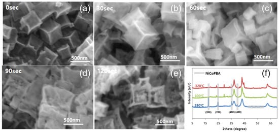 FE-SEM images of Ntime–NiCoPBA with different plasma treatments (time: 0, 30, 60, 90, and 120 s) followed by reduction (a–e); and (f) XRD results of N90–NiCoPBA after annealing at different temperatures for 90 s.