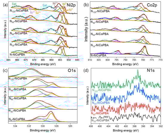 High-resolution XPS spectra of N0–NiCoPBA, N30–NiCoPBA, N60–NiCoPBA, N90–NiCoPBA, and N120–NiCoPBA for elements of Ni (a), Co (b), O (c), and N (d) binding energies.