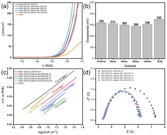 (a) LSV measurements of different synthesized catalysts towards OERs in 1 M KOH medium at a scan rate of 5 mV s−1; (b) Comparison between HER overpotentials of different synthesized catalysts at a current density of 10 mA cm−2: N0–NiCoPBA, N30–NiCoPBA, N60–NiCoPBA, N90–NiCoPBA, N120–NiCoPBA, RuO2; (c) Tafel slope of material under different plasma treatment times; (d) EIS results of N0–NiCoPBA, N30–NiCoPBA, N60–NiCoPBA, N90–NiCoPBA, and N120–NiCoPBA.