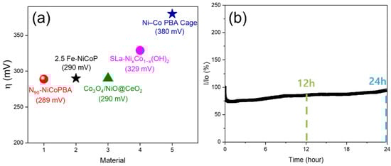 (a) Comparison of overpotential of N90–NiCoPBA catalyst with recent works at a current density of 10 mA cm−2, (b) Chronoamperometric measurements of N90–NiCoPBA material towards long-term OER operation.