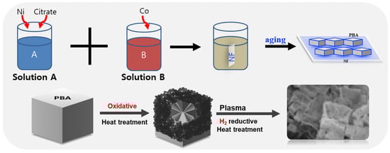 Prussian blue analogues (PBA) are constructed from the coordination of metal ions and cyanide via an in situ cation exchange effect [12,13]. PBA could be prepared using different metal centers (e.g., Fe(CN)63−, Fe(CN)64−, and Co(CN)63−) [14]. PBA could be generated with many synthesis methods using different morphologies and compositions, such as hollow structures [15], nanocages [16,17], flower-like structures [18], and spheres [19]. PBA can be modified through thermal treatment to produce porous metal oxides, selenides, and phosphides depending on the source of inlet gas used. This makes it suitable for many potential applications in electrocatalyst and energy conversion [20]. Recently, PBA-derived materials have been used for water splitting, including CoFe-PBA [21], Co PBA [22], and Co–Cu–Fe PBA [23], with extreme catalysis performance. Therefore, constructing N-doped NiCoPBA-derived self-supported nanocages on nickel foam is a practical strategy for designing efficient oxygen evolution reaction catalysts [24].