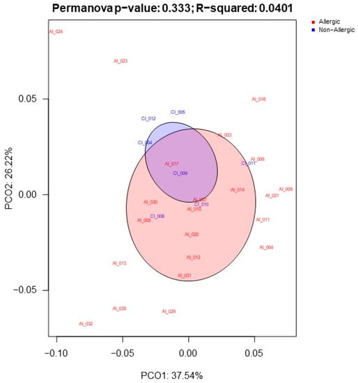 For an overview of the link between gut microbiota functionality and the development of CMA, a principal coordinate analysis (PCoA) was performed between AI and CI groups (Figure 1), aiming at seeking associations between two sets of variables. These analyses did not show significant differences in the gut microbiome of AI and CI.