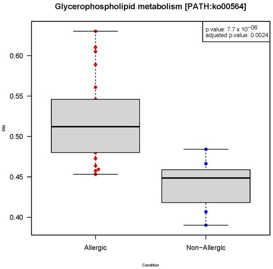 Box plot of the two groups of infants in relation to the abundance of glycerophospholipid metabolism counts. The y-axis shows the relative frequencies of the metabolic pathway reads. p-value = 7.7 × 10−6. The means and standard deviations of the groups were: Allergic = 0.521 ± 0.052 and Non-Allergic = 0.439 ± 0.033.