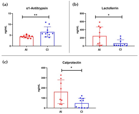 On the other hand, clear differences were observed between the AI and CI groups in fecal proteins obtained by immunodetection. First, α1-antitrypsin was found to be significantly decreased in AI. Majamaa et al. [48] observed that an increased concentration of fecal α1-antitrypsin is associated with CMA in infants with atopic eczema. However, other authors analyzed α 1-antitrypsin levels along with a panel of different markers in patients with GIT disorders and found no significant differences for this protein [32,49]. In relation to CMA, there are scarce data, and the results are contradictory.