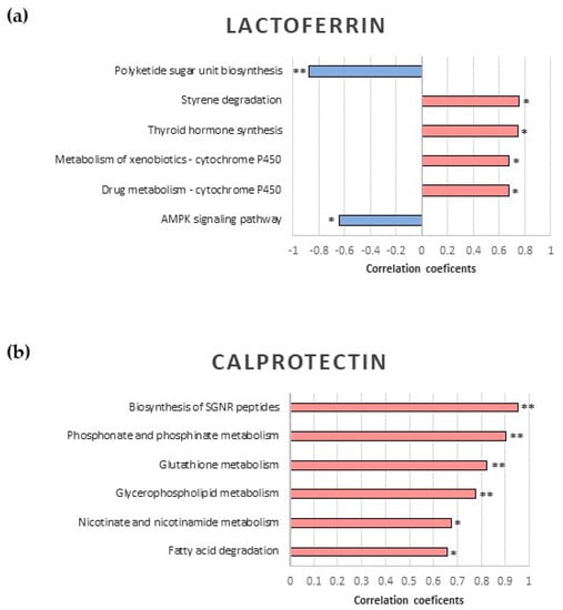 It was observed that α1-antitrypsin had no significant correlations in the chosen pathways. On the other hand, in the correlation analysis between lactoferrin concentrations and the 22 metabolic pathways, six significant pathways were obtained. Finally, the correlation analysis of fecal calprotectin yielded six significant metabolic pathways, four of which had a p-value < 0.005. These results are shown in Figure 4.