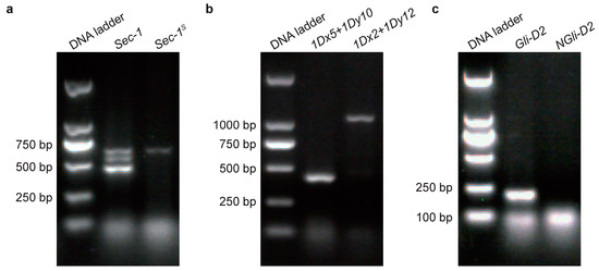 Identification of pyramids of Zhengmai 7698. (a) PCR amplification of the Sec-1S gene. (b) PCR amplification of the 1Dx5+1Dy10 subunit. (c) PCR amplification of the NGli-D2 gene.