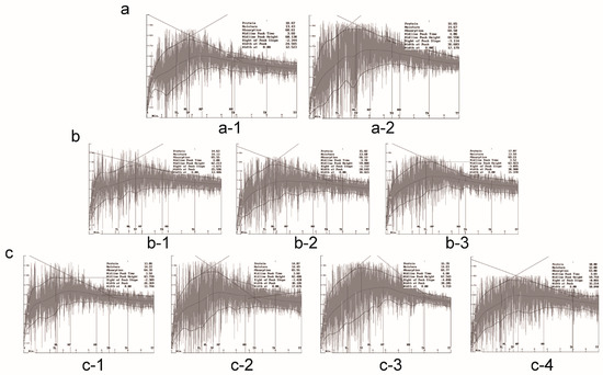 (a) Mixograph characteristics of Zhengmai genetic background samples, (a-1): CK Zhengmai 366 wild type, (a-2): type I digenic lines (1Dx5+1Dy10 and NGli-D2). (b) Mixing properties of Zhengmai 7698 genetic background samples, (b-1): CK Zhengmai 7698 wild type, (b-2): type II digenic lines (1Dx5+1Dy10 and Sec-1S) and (b-3): trigenic lines (1Dx5+1Dy10, NGli-D2 and Sec-1S). (c) Mixing properties of Hengguan 35, (c-1): CK Hengguan 35 wild type, (c-2): type I digenic lines (1Dx5+1Dy10 and NGli-D2), (c-3): type II digenic lines (1Dx5+1Dy10 and Sec-1S) and (c-4): trigenic lines (1Dx5+1Dy10, NGli-D2 and Sec-1S).