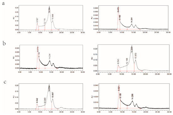 (a) Size exclusion (SE)-HPLC chromatogram of Zhengmai 366; (b) SE-HPLC chromatogram of Hengguan 35; and (c) SE-HPLC chromatogram of Zhengmai 7698.
