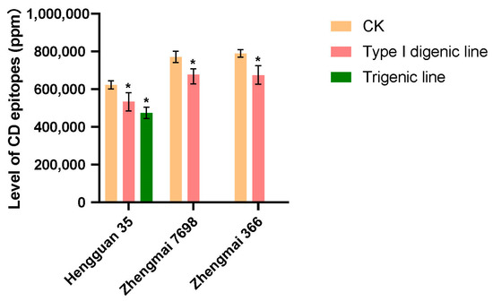 Comparison of CD epitopes between wild type and pyramids. The asterisk in the figure indicates significant differences between wild type and pyramid according to Tukey’s test (p < 0.05). CK: wild type; type I digenic lines: 1Dx5+1Dy10 and NGli-D2 pyramids; and trigenic lines: 1Dx5+1Dy10, NGli-D2 and Sec-1S pyramids.