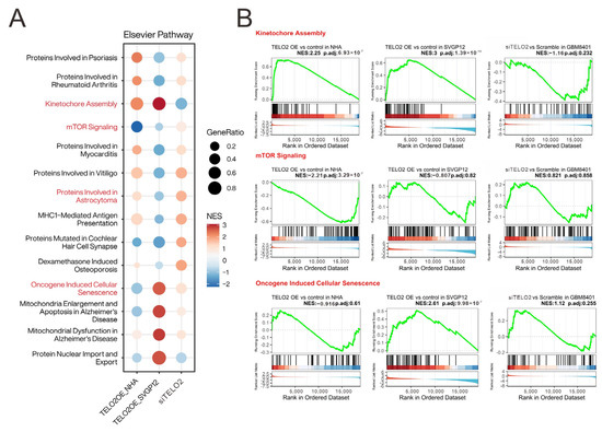 Our previous study demonstrated that human high-grade gliomas show increased TELO2 mRNA expression and that the overexpression of TELO2 mRNA correlates with shorter survival outcomes, suggesting that TELO2 is an oncogene in human gliomas [16]. Here, we tried to figure out the oncogenic role of TELO2 in tumorigenesis. Hence, we transiently overexpressed TELO2 mRNA in human glial and astrocyte cells and NHA and SVG p12, respectively, and silenced TELO2 mRNA expression in GBM8401 cells for the mRNA array analysis. We applied the Elsevier pathway to interpret our experimental data underlying the biology of diseases, responses to drugs, and a wide range of biological processes (Figure 1A). We highlighted the difference between overexpressing and silencing the TELO2 of normal and GBM cells in the Kinetochore Assembly, mTOR Signaling, Oncogene-Induced Cellular Senescence, and Proteins Involved in Astrocytoma gene set to conduct further analysis based on our previous findings of TELO2 overexpression in human high-grade gliomas. The results of the gene set enrichment analysis (GSEA) of Kinetochore Assembly, mTOR Signaling, and Oncogene-Induced Cellular Senescence are shown in Figure 1B.