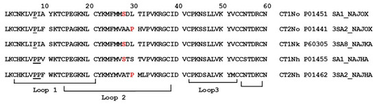 Cobra venom cardiotoxins (cytotoxins, CaTx) are small proteins belonging to the family of three-finger toxins [1]. They are one of the main components of cobra venoms and, in the victim organism, affect the cardiovascular system. The structure of the CaTx molecule is characterized by three β-structured polypeptide loops emerging from a small hydrophobic core stabilized by four disulfide bonds. According to differences in the interaction with zwitterionic phospholipid dispersion, S- and P-types of CaTx were distinguished [2]. The toxins of the S-type comprise a serine residue at position 28 (Figure 1) of the amino acid sequences, and never have proline at position 30, at which usually leucine, lysine, or serine residues are located. CaTXs of the P-type contain a proline residue at position 30 and alanine at position 28 in most sequences. On the basis of structural studies, CaTx were classified in two other subclasses, i.e., groups I and II [3,4]. Group I CaTx is characterized by the presence of two proline residues at position 8 and 9 as well as an aromatic residue (tyrosine or tryptophan) at position 11 of the amino acid sequence. All other CaTxs were of group II.