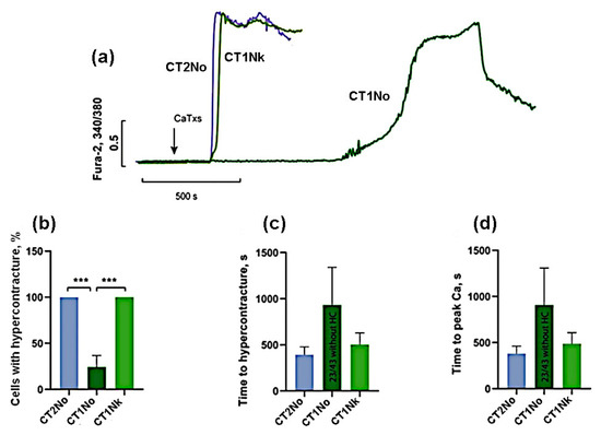 Comparison of the CaTx effects at a concentration of 10 µg/mL. (a) Typical example of recording a fluorescent Fura-2 signal. An arrow indicates application of cardiotoxins. (b) Number of cells with HC after 30 min of CaTx application (c) Time of the onset of the HC. (d) Time to the maximum rate of increase in concentration of intracellular Ca2+. CT2No (n = 6); CT1Nk (n = 6); and CT1No (n = 3). Asterisks indicate the significant differences at *** p < 0.005.