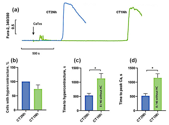 Comparison of the effects of CaTxs at a concentration of 100 µg/mL. (a) Typical example of recording a fluorescent Fura-2 signal. An arrow indicates the application of cardiotoxins. (b) Number of cells with HC after 30 min of CaTx application. (c) Time of the onset of the HC. (d) Time to the maximum rate of increase in the concentration of intracellular Ca2+. CT2Nh (n = 4) and CT1Nh (n = 4). Asterisks indicate the significant differences at * p < 0.05.