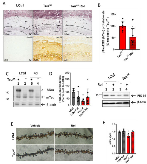 - Kremer, A.; Maurin, H.; Demedts, D.; Devijver, H.; Borghgraef, P.; Van Leuven, F.; Takata, N.; Mishima, T.; Hisatsune, C.; Nagai, T.; et al. Early improved and late defective cognition is reflected by dendritic spines in Tau.P301L Mice. J. Neurosci. 2011, 31, 18036–18047. [Google Scholar] [CrossRef]