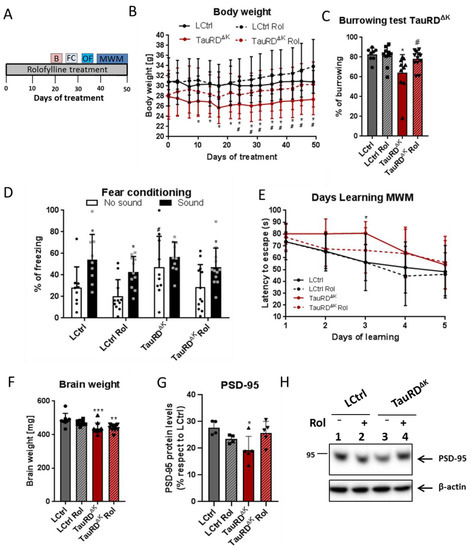 Rolofylline decreased cognitive deficits in TauRDΔK mice. Fifteen-month-old animals expressing TauRDΔK and their littermate controls were treated with rolofylline for 2.5 months, ~6 months after onset of cognitive decline. Data are expressed as a percentage mean ± SD. (A) Timeline of the behavior paradigms used during the treatment. (B) Rolofylline treatment prevented a decrease in body weight observed in animals expressing mutant TauRDΔK. Two-way ANOVA (n = 9–13 per group) revealed significant main effects of the factors of “time” (F(14, 546) = 11.79, p < 0.0001) and “treatment” (F(3, 39) = 3.27, p = 0.0314), as well as a significant factor interaction (F(42, 546) = 2.34, p < 0.0001). The latter indicates that body weight developed differently within groups. The body weight of LCtrl mice remained constant throughout the observation period. In contrast, the body weight of TauRDΔK mice was significantly different from LCtrl from day 10 onwards (Tukey’s post-hoc; * p < 0.05) and from rolofylline-treated LCtrls from day 24 onwards (Tukey’s post-hoc; # p < 0.05). Rolofylline-treated TauRDΔK Rol mice showed no statistical difference compared to control animals at any time point analyzed. (C) After 20 days of rolofylline treatment, TauRDΔK mice showed improved burrowing behavior (F(3, 36) = 4.87, p = 0.0061; n = 8–12 per group). There was a significant difference between LCtrl and TauRDΔK (Tukey’s post-hoc p = 0.0125; * p < 0.05 when compared to LCtrl) and between TauRDΔK and TauRDΔK Rol (p = 0.0471; # p < 0.05 when compared to TauRDΔK). LCtrl and TauRDΔK Rol were not significantly different with respect to burrowing (p = 0.8368). (D) Rolofylline treatment also improved performance in the fear conditioning test. There was a significant difference between contextual (no sound) and cue-induced (sound) freezing for LCtrl and LCtrl Rol (F(1, 76) = 19.62, p < 0.0001, Sidak’s post-hoc p < 0.05, black *), but not for TauRDΔK mice (p = 0.7525). Rolofylline-treated TauRDΔK Rol mice showed a statistic tendency (p = 0.0905, grey *). TauRDΔK mice showed more contextual freezing (no sound) than the other groups, which was significant compared to the LCtrl Rol group (F(3, 76) = 3.99, p = 0.0108, Sidak’s post-hoc p = 0.0138; #). (E) Rolofylline treatment improved learning speed of TauRDΔK mice in the Morris water maze test (Two-way ANOVA F(3, 39) = 3.56, p = 0.0227 for factor “treatment”, n = 9–13 per group). TauRDΔK mice needed more time to decrease the latency to escape, with a significant difference between LCtrl and TauRDΔK on learning day 3 (Dunnett’s post-hoc p = 0.0084, *). In contrast, there was no significant difference between LCtrl and TauRDΔK Rol (p > 0.28 on all days tested). (F) The loss in brain weight in TauRDΔK animals was not reversed by rolofylline treatment (F(3, 36) = 7.38, p = 0.0006, n = 8–12 per group). Both TauRDΔK and TauRDΔK Rol mice had significantly lighter brains compared to LCtrl (Dunnett’s post-hoc p = 0.0006 *** and 0.0022 **, respectively). (G) Protein levels of PSD-95 in the hippocampus of untreated TauRDΔK mice were significantly lower when compared to LCtrl (one-way ANOVA, F(3, 14) = 4, p = 0.0285; Tukey’s post-hoc p = 0.0263, *; n = 4–5/group); meanwhile, no differences were observed between LCtrl and rolofylline-treated TauRDΔK (p = 0.8637). There was no difference between transgenic animals, although PSD-95 had a clear trend to increase after rolofylline treatment (p = 0.0831). (H) Representative western blot of PSD-95.
