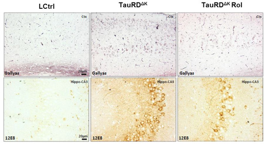Finally, rolofylline treatment improved the expression of the postsynaptic protein PSD-95 in TauRDΔK mice (Figure 3G,H), similar to what we observed in the TauΔK mice treated with rolofylline, and similar to the reversal after switching off the expression of the transgene in regulatable mice [11]. When analyzing tau pathological markers, rolofylline treatment promoted a reduction in the number of Gallyas silver-positive NFTs in the cortex of TauRDΔK-treated mice as well as a decrease in human transgenic phosphorylated tau (12E8; epitope pSer262/pSer356) checked by immunostaining (Figure 4).