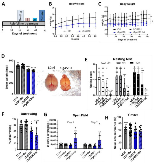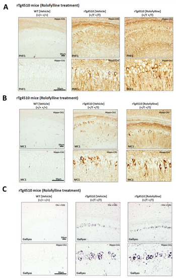 - Blackmore, T.; Meftah, S.; Murray, T.K.; Craig, P.J.; Blockeel, A.; Phillips, K.; Eastwood, B.; O’neill, M.J.; Marston, H.; Ahmed, Z.; et al. Tracking progressive pathological and functional decline in the rTg4510 mouse model of tauopathy. Alzheimer’s Res. Ther. 2017, 9, 77. [Google Scholar] [CrossRef] [PubMed]