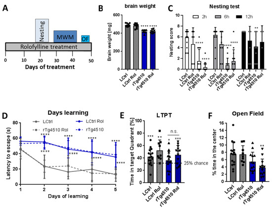 Early (preventive) treatment with rolofylline does not protect against cognitive impairment in rTg4510 mice. Transgenic and control animals were treated with food containing 5 mg/kg of rolofylline at 2.5–3 months of age (at the beginning of the typical onset of tau pathology) for 1.5 months. After 3 weeks of treatment, several behavior assessments were performed. For all experiments, results are shown a mean ± SD (n = 7–16/group). (A) Timeline of the behavior paradigms used during the treatment. (B) Transgenic animals presented reduced brain weight, which was not affected by adenosine A1 antagonist treatment (F(3, 33) = 34.36, p < 0.0001, n = 7–12 per group). Both rTg4510 and rTg4510 Rol had lighter brains compared to LCtrl (Dunnett’s post-hoc p < 0.0001 for both comparisons, ****). (C) Nesting test with rolofylline or without rolofylline treatment for rTg4510 mice and controls, scored after 2, 6, and 12 h after introduction of the nestlet. Transgenic animals showed a worse performance at 2 h and 6 h (main effect of the “treatment” factor in two-way ANOVA with F(3, 141) = 44.4; p < 0.0001; Tukey’s post-hoc p < 0.0001 at 2 h and 6 h, ****; for comparison with LCtrl). At 12 h, non-treated transgenic animals were still performing significantly worse than LCtrl (p = 0.0019, **), but rolofylline-treated rTg4510 mice had a clear trend toward improvement (p = 0.0569, when compared to non-treated rTg4510 mice). No significant differences were observed in transgenic animals after rolofylline treatment (Tukey’s post-hoc p > 0.47 at all points) and treatment has also no effect on controls (p > 0.43 at all timepoints). (D) The Morris water maze test shows the time (in seconds) mice take to find the hidden platform during the learning phase. Transgenic animals show an increase in latency to reach the platform during the learning trials with no improvement after rolofylline treatment (F(3, 47) = 37.12 for the factor of “treatment”, with Dunnett’s post-hoc p < 0.0001 for the comparisons rTg4510 vs. LCtrl and rTg4510 Rol vs. LCtrl at days 2–5, ****). There was no significant difference between rTg4510 and rTg4510 Rol at any time. (E) Percentage of time spent in the target quadrant (where the hidden platform was) during the Morris water maze long-term probe trial (LTPT), performed 72 h after the last training day. In the one-sample t-test, all groups explored significantly more the platform quadrant (p = 0.0001 for LCtrl, ***; p = 0.0012 for LCtrl Rol, **; p = 0.0138 for rTg4510, *; and p = 0.0003 for rTg4510 Rol, ***). When comparing % of exploration time between groups, one-way ANOVA showed no main effect of treatment (F(3, 47) = 2.24, p = 0.0964). n.s. = Not Statistically Significant (F) Open field test: graph showing the mean percentage of time animals spent in the center of the arena during 10 min. Rolofylline-treated rTg4510 mice presented increased anxiety shown by the reduced time spent in the center of the arena (F(3, 47) = 5.38, p = 0.0029, Dunnett’s post-hoc p = 0.0023 for the comparison rTg4510 Rol vs. LCtrl, **).