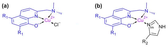 - Sgarlata, C.; Arena, G.; Bonomo, R.P.; Giuffrida, A.; Tabbì, G. Simple and mixed complexes of copper(II) with 8-hydroxyquinoline derivatives and amino acids: Characterization in solution and potential biological implications. J. Inorg. Biochem. 2018, 180, 89–100. [Google Scholar] [CrossRef]