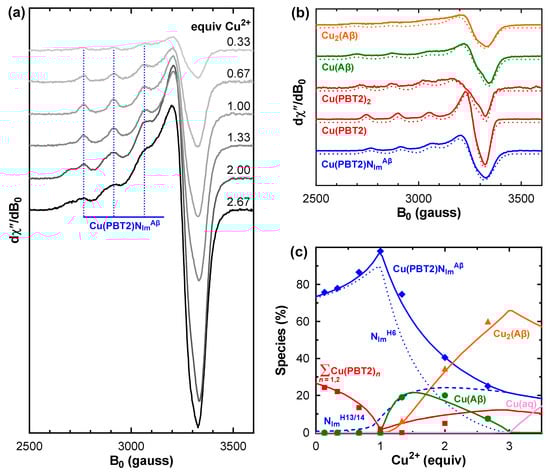 The above method assumed that the frozen-solution EPR spectra of Cu(PBT2)NImH6 and Cu(PBT2)NImH13/14 are indistinguishable, which is justified by the identification of a common set of spin Hamiltonian parameters for numerous Cu(PBT2)NIm complexes with different NIm donor ligands (Table 1 and Table S1). This assumption was also shown to be true for ternary Cu2+ complexes of different NIm donors with other terdentate ligands such as the non-chlorinated homologue of PBT2 (Table S1), the GHK tripeptide [16,28], and α-synuclein [29].