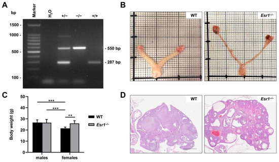 Esr1−/− phenotype characteristics have been described in various studies [8,34]. Most strikingly, female Esr1-deficient mice exhibit impaired development of reproductive organs. In particular, uteri of respective mice are hypoplastic compared to WTs, while knockout ovaries further develop distinct haemorrhagic, cystic follicles (Figure 1B,D) [8]. In addition, total body weight, which is a general readout for the murine metabolism [36], showed a 1.2-fold increase in Esr1-depleted females when compared to female WT littermates, WT males, or Esr1-deficient males (Figure 1C).