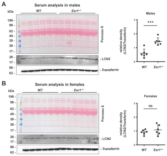 Analysis of serum LCN2 quantities in wild-type (WT) and Esr1 null mice. Serum LCN2 levels were determined in (A) male and (B) female mice by Western blot analysis. Ponceau S stain and probing with transferrin were used to demonstrate equal loading. Protein expression of LCN2 was quantified densitometrically and is shown relative to transferrin expression. The Student’s t-test was used for statistical analysis. Significant differences between groups are indicated with asterisks: *** p < 0.001. Data are expressed as mean ± SD and non-significant results are marked with ns.