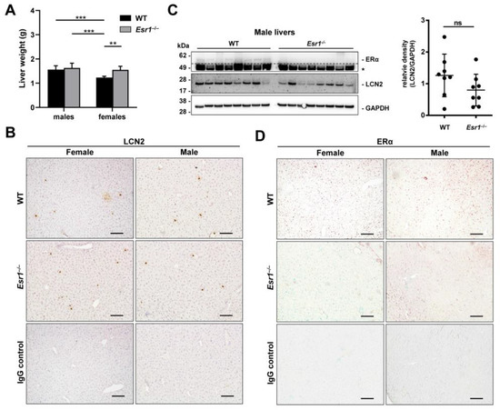Next, reverse transcription and quantitative real-time PCR (RT-qPCR) analysis was used to compare the hepatic mRNA expression of Lcn2 in WT and Esr1−/− females and males (Figure S2). Although we observed a strong variation in female WT mice, respective animals exhibited significantly increased LCN2 expression compared to female Esr1-deficient mice and males that both showed similar expression of LCN2.