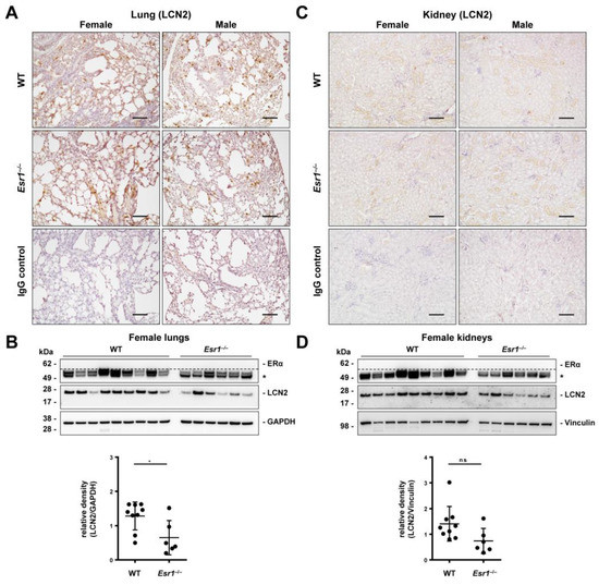 LCN2 and ERα expression in the lung and kidney. Tissues from wild-type (WT, female: n = 9, male: n = 8) and Esr1 knockout (female: n = 6, male: n = 8) mice were either embedded in paraffin for immunostaining or processed for protein analysis. Immunohistochemistry staining was performed to localize LCN2 expression in (A) lung and (C) kidney tissue. Isotope-specific negative control IgG staining was performed to document antibody specificity. Magnifications: 100×; scale bar: 100 µm. LCN2 and ERα protein expression was analyzed in (B) lung and (D) kidney tissues by Western blot analysis in WT and Esr1 null mice. The expression of GAPDH (lungs) and vinculin (kidneys) was used to demonstrate equal protein loading. Unspecific bands are marked with asterisks (*) and are separated from specific bands by dashed lines. Protein expression of LCN2 was quantified densitometrically and plotted relative to the expression of the loading control. Mann–Whitney test (lungs) or Student’s t-tests (kidney) was used for statistical analysis. Significant differences between groups are indicated with asterisks: * p < 0.05. Data are displayed as means ± SD and non-significant results are marked with ns.