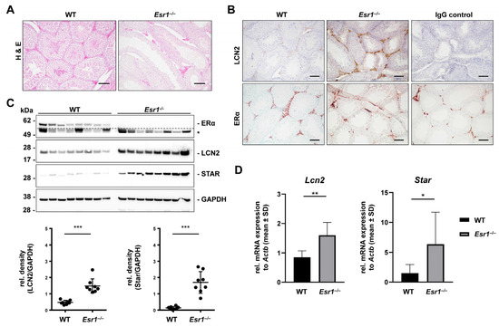 ERα is involved in key functions of the male urogenital system [45]. Both male and female homozygous Esr1-deficient mice are infertile [34]. However, the reproductive tracts of female animals already show macroscopic changes that indicate a reproductive defect (cf. Figure 1B), whereas the male reproductive tract appears normal (cf. Figure S4A [34]. Histological examination of Esr1-depleted males showed that they develop distinct histological morphologies in testes, efferent ductuli, and epididymis [45]. In contrast, the effects of LCN2 in the male reproductive tract remain poorly understood. Studies show that testicular LCN2 expression increases with age and is primarily limited to Leydig cells [25], which express ERα as well. In addition, Leydig cells hold important functions in the production of sex hormones and the regulation of spermatogenesis [45]. To determine possible interactions between LCN2 and ERα in testis, we next compared Esr1-deficient tissues with WT samples.