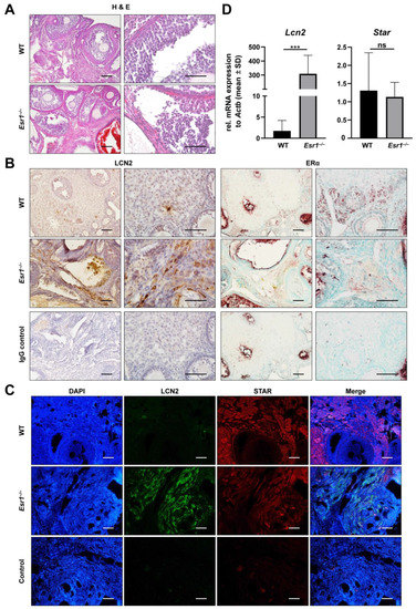 In contrast to LCN2 expression in the uterus, very little is known about its physiological role in ovarian tissue [51,52]. Clinically, LCN2 is discussed in the context of polycystic ovary syndrome (PCOS) and ovarian cancer [53,54,55,56]. ERα is strongly expressed in the murine ovary but limited to interstitial theca and stromal cells [8]. To date, nothing is known about interactions between ERα and LCN2 in the ovary. Therefore, we next investigated whether there is a link in the murine ovary. To do so, reproductive tissue sections were first subjected to routine H & E staining. Esr1-deficient ovaries exhibited haemorrhagic cystic follicles, as previously described (Figure 6A) [34]. Immunohistochemical staining confirmed interstitial and stromal cells as sites of nuclear ERα expression (Figure 6B, right panels). In WT ovaries, isotope-specific IgG negative controls showed low background signals, whereas unspecific staining (red and brown) occurred when Esr1−/− ovaries were stained with the IgG negative control. Immunohistochemical localization of LCN2 in WT ovaries showed scattered, punctual, and positive staining, mostly located in stromal tissue (Figure 6B, left panels). In contrast, Esr1 knockout ovaries displayed markedly increased quantities of LCN2-positive cells, which were mainly restricted to stromal interstitial tissue. Additionally, ovarian tissue samples were analyzed for LCN2 and STAR expression by immunofluorescence double staining. As in Leydig cells of testis tissue, STAR is a key factor in theca and granulosa cells related to steroid hormone production in the ovary [57]. Our staining confirmed expression in interstitial cells of the ovary (Figure 6C). Interestingly, ovaries taken from female WTs showed very low LCN2 staining, which was distributed to single small cells, while Esr1 knockout ovaries showed strong LCN2 expression in large cell clusters (Figure 6B,C). Additionally, WT ovaries showed a slightly stronger STAR signal compared to Esr1−/− animals.