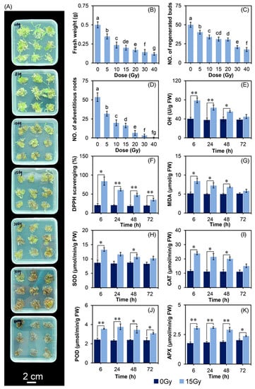 Effects of CIB radiation on development and oxidative stress physiology of TKS. (A) Phenotypic variation, (B) FW, and (C) the number of buds at 15 days after CIB irradiation, bar = 2 cm. (D) The number of roots of adventitious buds on the 30th day after CIB irradiation. (E) OH• generation activity, (F) DPPH radical-scavenging activity, and (G) MDA content. (H) The activities of SOD, (I) of CAT, (J) of POD, and (K) of APX on adventitious buds irradiated by the CIB at doses of 0 and 15 Gy. The error bars represent the Means ± SD, data followed by the same alphabetic letters in (B–D) are not significantly difference between any two groups (p > 0.05) according to the Duncan’s test; * p < 0.05, ** p < 0.01.