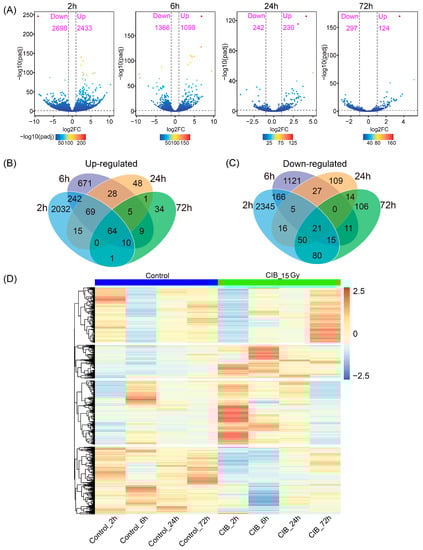 DEGs detected in TKS after 15 Gy CIB irradiation. (A) Numbers of up- and down-regulated DEGs in different comparisons. (B) Venn diagram of up-regulated DEGs in different comparisons. (C) Venn diagram of down-regulated DEGs in different comparisons. (D) Heatmap of all DEGs. Red and blue indicate up-regulated and down-regulated genes, respectively.