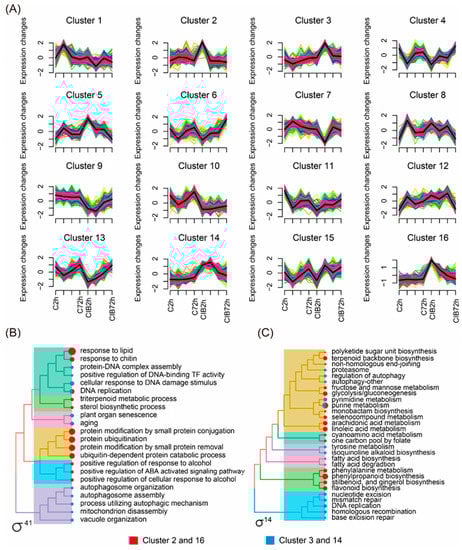 Transcriptome-wide time-series cluster of DEGs. (A) Cluster analysis of DEGs based on R package of ClusterProfiler 4.0. (B,C) DEGs were further categorized into different functional groups by GO and KEGG enrichment analysis. The red square represents Clusters 2 and 16, and the blue square represents Clusters 3 and 14. Yellow or green colored lines correspond to genes with low membership value; red and black colored lines correspond to genes with high membership value.