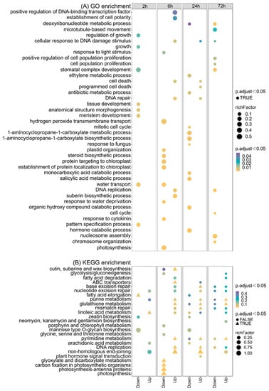 To determine the function of the identified DEGs between the control and CIB irradiation treatment samples of TKS adventitious buds, we performed GO and KEGG enrichment analysis. The enriched GO terms from all DEGs across different comparisons are shown in Figure 4. At 2 h, the significantly down-regulated pathways were mainly associated with the pattern specification process, water transport, growth, and development. At 6 h, the significantly down-regulated pathways were mainly related to photosynthesis, plant hormones, the protein metabolism process, and the response to stimulus. However, the significantly up-regulated pathways were primarily associated with DNA damage/repair, cell death, and cell morphogenesis. At 24 h, the significantly down-regulated pathways were mainly associated with plant hormones, cell cycle, and nucleic acid metabolism. Furthermore, the up-regulated pathways were mainly associated with DNA repair, cell death, and response to stimulus. At 72 h, the significantly down-regulated pathways were mainly present for the cell cycle, DNA replication, nucleic acid metabolism, and cytoskeleton (Figure 4A).