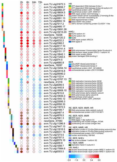 At the same time, DEGs in the DNA repair pathways were detected, including homologous recombination (HR), non-homologous end-joining (NHEJ), nucleotide excision repair (NER), and base excision repair (BER) (Figure 5). The DEGs involved in the HR pathway after CIB irradiation were mainly ATP-dependent DNA helicase Q-like 1, Q-like 4A, DNA repair protein recA homolog 1, protein breast cancer susceptibility 2 homolog B-like, protein chromatin remodeling 25, DNA topoisomerase 3-beta, DSS1/SEM1-like protein, and SNF2 domain-containing protein CLASSY 1-like. In the NHEJ pathway, the CIB can induce KU70 isoform X1, X2, KU80, DNA repair protein XRCC4, and DNA ligase 4 (LIG4). The NER pathway involves RNA polymerase II transcription factor B subunit 4, DNA excision repair protein ERCC-1 isoform X1, DNA repair protein RAD4, and protein damaged DNA-binding 2. Regarding the BER pathway, the poly (ADP ribose) polymerase (PARP) 1, PARP 2, hypothetical protein LSAT_3X140620, and uncharacterized protein LOC111918964 genes were up- or down-regulated (Figure 5). Most DNA damage repair genes were up-regulated after CIB irradiation. The DEGs at 2 and 6 h after irradiation were much more than those at 24 and 72 h, indicating that the repair time of DNA damage was mainly within one day after acute irradiation.
