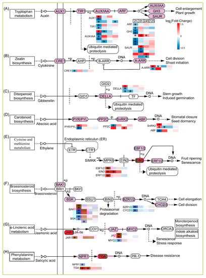 Plant hormones not only participate in morphogenesis, but also play an important role in protecting plants from environmental stress factors and regulating a variety of adaptive responses. We also focused on the DEGs associated with the plant hormone signal transduction pathway (Figure 6). In the case of 2, 6, 24, and 72 h after CIB irradiation, there were 15 DEGs in the auxin signal (auxin transporter-like protein 2, transport inhibitor response 1-like protein Os04g0395600, hypothetical protein LSAT_4X56881, auxin-induced protein 22D-like, IAA27-30, auxin response factor 9-like isoform X2, GH3.1, GH3.5, GH3.6, ARG7, SAUR23, SAUR36, SAUR50, SAUR71, auxin-induced protein 6B); 3 (histidine kinase 4-like, ARR5, ARR17) cytokinine (CK)-mediated signal pathways; 2 (della protein GAI1-like, della protein GAI-like) in the gibberellin (GA)-mediated signal pathways; 5 (abscisic acid receptor PYL4, protein phosphatase 2C (PP2C), SRK2A, SRK2I, abscisic acid-insensitive 5-like protein 2) in the abscisic acid (ABA)-mediated signal pathways; 3 (EIN3-binding F-box protein 1-like, EIN3-like family protein, ethylene-responsive transcription factor 1B-like) in the ethylene (ET)-mediated signal pathway; 4 (brassinosteroid insensitive 1-associated receptor kinase 1-like, probable serine/threonine-protein kinase At4g35230, protein brassinazole-resistant 1-like, cyclin-D3-2-like) in the brassinosteroid (BR)-mediated signal pathways; 3 (jasmonic acid-amido synthetase JAR1-like isoform X2, protein TIFY 10A-like, transcription factor MYC2-like) in the jasmonic-acid (JA)-mediated signal pathway; 2 (regulatory protein NPR5, transcription factor TGA2.2-like) in salicylic acid (SA) (Figure 6). Overall, CIB irradiation resulted in the differential expression of a series of genes that are involved in multiple plant hormone signal transduction pathways. In brief, auxin, CK, GA, and BR signal pathways were negatively regulated at four time points after CIB irradiation, whereas ABA and SA had dual effects on adventitious buds after CIB irradiation. The ET and JA signal pathway was positively regulated on adventitious buds after CIB irradiation. In conclusion, multiple plant hormones displayed different expression change tendencies at different time points after CIB irradiation. Our results indicate that the response to CIB irradiation is regulated by multiple hormones and interact with each other.