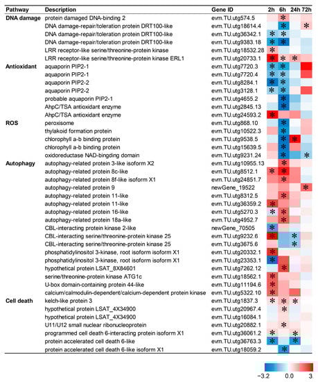 Apoptosis or programmed cell death is a highly controlled cellular process essential for plant homeostasis. To gain insight into the CIB-irradiation-mediated death signal network, 42 genes related to the death response were identified from DEGs, including DNA damage, ROSs, antioxidants, autophagy, and cell death (Figure 7). Expression profiles showed that 12, 12, 4, and 2 genes were up-regulated after 2, 6, 24, and 72 h CIB irradiation treatment, respectively whereas 10, 15, 3, and 1 gene were down-regulated after 2, 6, 24, and 72 h of CIB irradiation treatment, respectively. This indicated that more death-responsive genes were activated within 6 h after CIB irradiation.