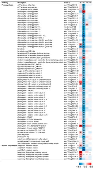 Response patterns of photosynthesis- and rubber-related genes to CIB irradiation. Using log2 (fold change) to make the heat map, red represents up-regulated genes, and blue represents genes down-regulated genes. “*” represents a significant difference of gene. “--" indicating that gene expression was not detected at the relevant time points after carbon ion beam irradiation.