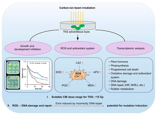 TKS: Taraxacum kok-saghyz; NR: natural rubber; CIB: carbon-ion beam; OH•: hydroxyl radical; DPPH: 1,1-diphenyl-2-picrylhydrazyl; MDA: malondialdehyde; SOD, superoxide dismutase; CAT: catalase; POD: peroxidase; APX: ascorbate peroxidase; AsA: ascorbate; GSH: glutathione; DEG: differentially expressed gene; GO: Gene Ontology; KEGG: Kyoto Encyclopedia of Genes and Genomes; HB: Hevea brasiliensis; HIB: heavy-ion beam; IR: ionizing radiation; LET: linear energy transfer; DSB: double-stranded break; RBE: relative biological effectiveness; FW: fresh weight; ROS: reactive oxygen species; HR: homologous recombination; NHEJ: non-homologous end-joining; NER: nucleotide excision repair; BER: base excision repair; LIG4: ligase 4; PARP: poly (ADP-ribose) polymerase; CK: cytokinine; GA: gibberellin; PP2C: protein phosphatase 2C; ABA: abscisic acid; ET: ethylene; BR: brassinosteroids; JA: jasmonic acid; SA: salicylic acid; MS: Murashige & Skoog; 6-BA: 6-benzyladenine; NAA: α-naphthaleneacetic acid; HIRFL: Heavy Ion Research Facility in Lanzhou; Gy: Gray; RNA-seq: RNA-sequencing; SBS: sequencing by synthesis; FPKM: fragments per kilobase of exon per million fragments mapped; FC: fold change.