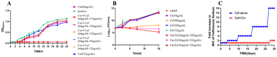 Chicago/Turabian StyleYin, Lizi, Yuhong Gou, Yuyun Dai, Tao Wang, Kexin Gu, Ting Tang, Sajjad Hussain, Xiaoli Huang, Changliang He, Xiaoxia Liang, and et al. 2023. "Cinnamaldehyde Restores Ceftriaxone Susceptibility against Multidrug-Resistant Salmonella" International Journal of Molecular Sciences 24, no. 11: 9288. https://doi.org/10.3390/ijms24119288