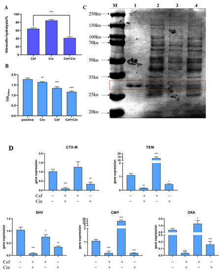 2.3. The Effect of Cinnamaldehyde Combined with Ceftriaxone Sodium on Bacterial β-lactamase and Its Gene Expression