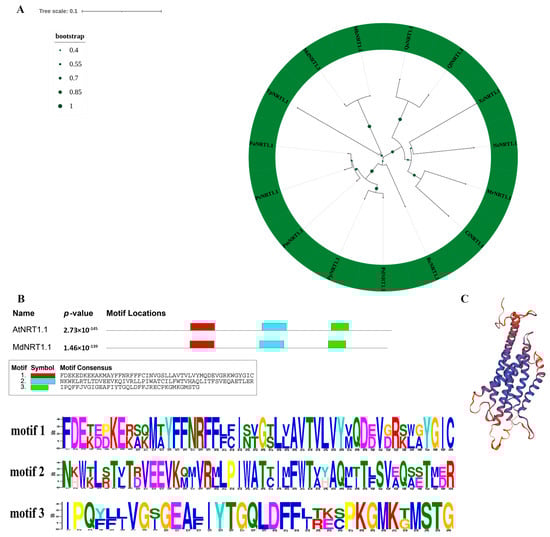 Phylogenetic tree analysis of NRT1.1. (A) Phylogenetic relationship analysis of MdNRT1.1 and 14 other plant NRT1.1 proteins obtained from the NCBI database. MdNRT1.1: Malus domestica, XP_008358135.1; CiNRT1.1: Carya illinoinensis, KAG6685326.1; MbNRT1.1: Malus baccata, TQE14061.1; MrNRT1.1: Morella rubra, KAB1217036.1; NsNRT1.1: Nyssa sinensis, KAA8522245.1; PaNRT1.1: Prunus armeniaca, CAB4279591.1; PvNRT1.1: Prunus avium, XP_021823895.1; PdNRT1.1: Prunus dulcis, XP_034214918.1; PmNRT1.1: Prunus mume, XP_008238567.1; PpNRT1.1: Prunus persica, ONI06660.1; QiNRT1.1: Quercus Iobata, XP_030948025.1; QsNRT1.1: Quercus suber, POE48521.1; RcNRT1.1: Rosa chinensis, XP_024168946.1; TpNRT1.1: Trifolium pratense, XP_045789551.1; XsNRT1.1: Xanthoceras sorbifolium, KAH7549611.1. (B) The conserved domains of MdNRT1.1 and AtNRT1.1 were analyzed by MEME. (C) The 3D structure map of the MdNRT1.1 protein.
