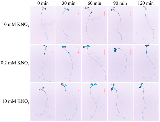 The GUS staining buffer contained 1 mM 5-Bromo-4-chloro-3-indolyl-β-glutamic, 0.01 mM EDTA, 0.5 mM ferricyanide, 100 mM sodium phosphate (PH 7.0), and 0.1% (v/v) Triton X-100, and it was kept at 37 °C in the dark. A total of 2 mM KCl (representing 0 mM NO3−) and 0.2 mM and 10 mM NO3− invaded the Arabidopsis at different time periods. The 7-day-old ProMdNRT1.1::GUS transgenic Arabidopsis GUS staining procedure was performed for 12 h, and then the transgenic Arabidopsis were immersed in GUS staining solution, followed by de-staining with anhydrous ethanol for 24 h [58].